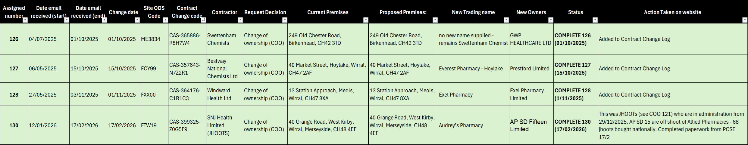 However we will be keeping, and publishing at regular intervals, a record of all contract changes received from Primary Care Support England that relate to Wirral Pharmacy Contractors.